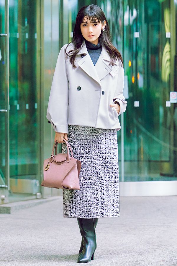 通勤ペンシルのスタメンと言えばやっぱりツイード。カラーツイードで遊び心を盛り込みつつ、端正なWコートできちんと感を念押し。