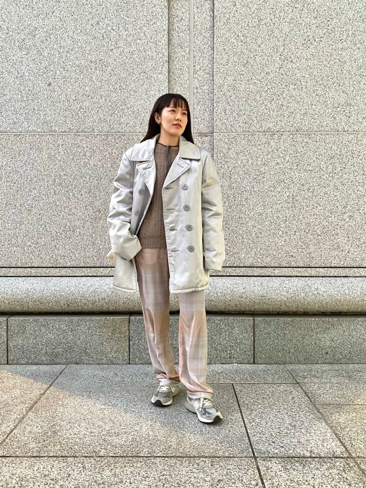 「冬は暗いコーディネートになりがちなので、明るいグレイッシュなトーンでスタイリングをしました。中綿入りで真冬まで温かく着られるアウターはオーバーサイズなので、ボトムスを細めにしてバランスを意識しています。シルクのパンツは大好きなショップ ewerで購入したヴィンテージのDries Van Noten。オーナーのセレクトがよく、色味が絶妙で気に入っています」