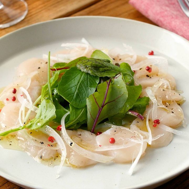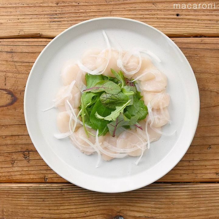 4: 皿にホタテ、ベビーリーフ、玉ねぎを盛り付けます。