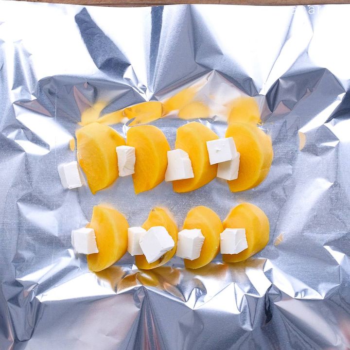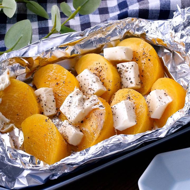 2: アルミホイルに柿、クリームチーズをのせて包み、トースター200℃で15分加熱します。