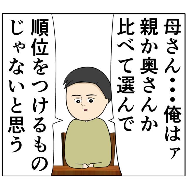 良し男さんは、自分の考えを伝えました。「母さん、俺は親か奥さんか比べて選んで、順位をつけるものじゃないと思う。」