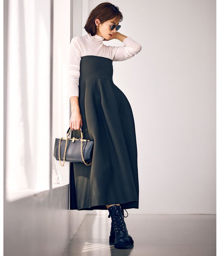 洗練感を左右する大人のワンピ選びは、構築フォルムが圧勝。胸下の切り替えでスタイルアップ。下半身もカバーできます。