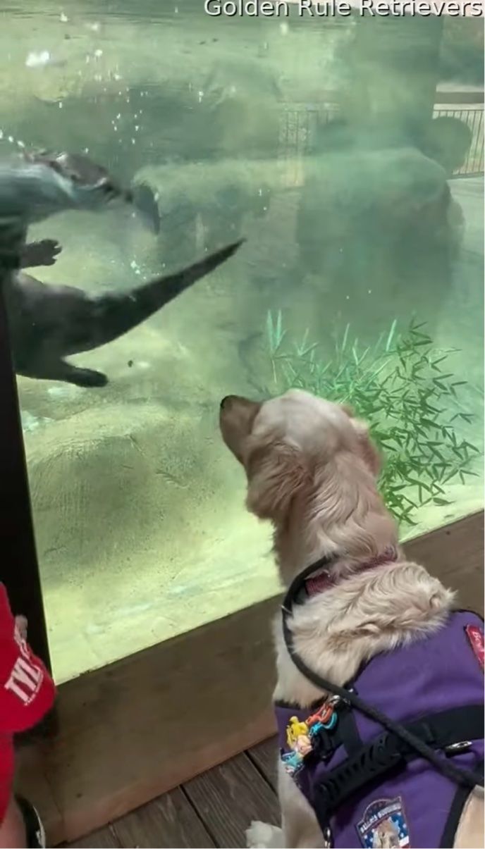 3. ゴールデンレトリバーがひとめぼれ!?水槽の前に張りついて熱心に見つめるそのお相手は・・カワウソ!?【アメリカ・動画】