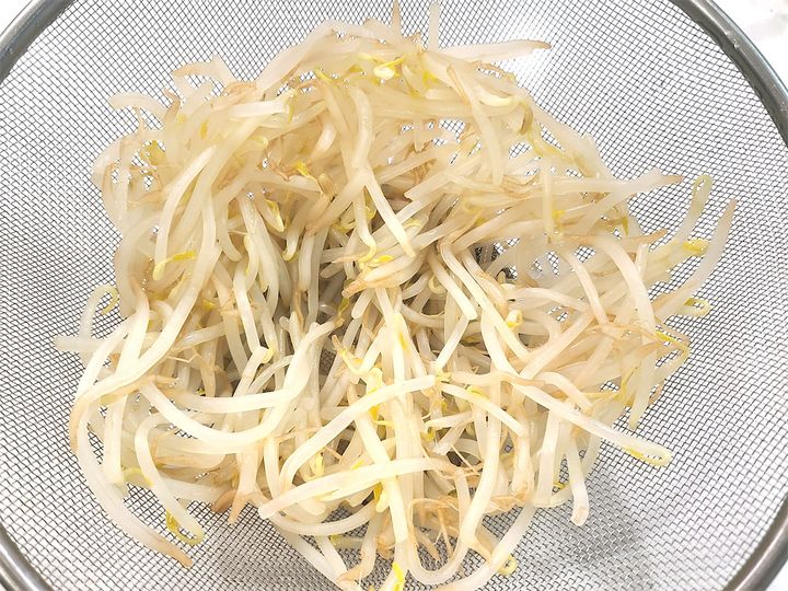 3.茹で上がったもやしをザルに上げ、少し置いて水気を切り、粗熱も取ります。