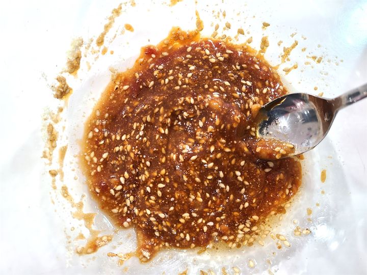 2.茹でている間にタレを作ります。鶏ガラスープの素、豆板醤、オイスターソース、しょうゆ、ゴマ油をよく混ぜ合わせ、白いりゴマを少し指でつぶしながら加えます。そうすることでなじみがよくなるそうです。
