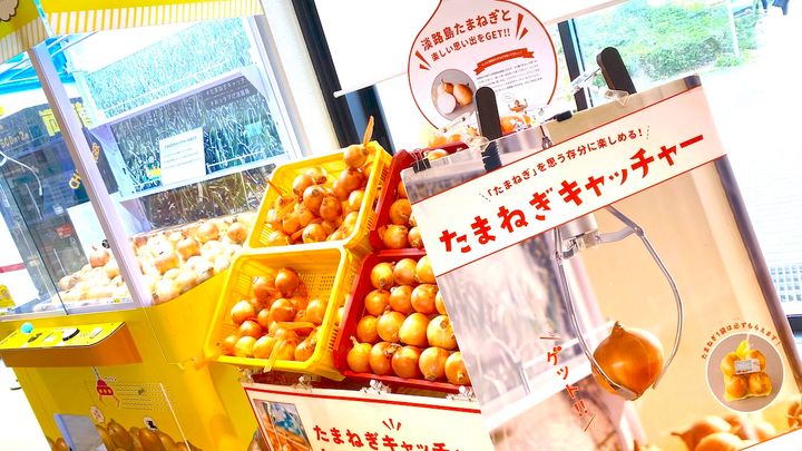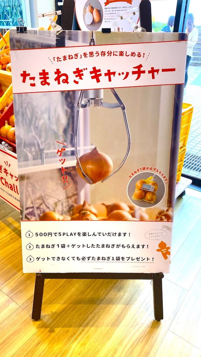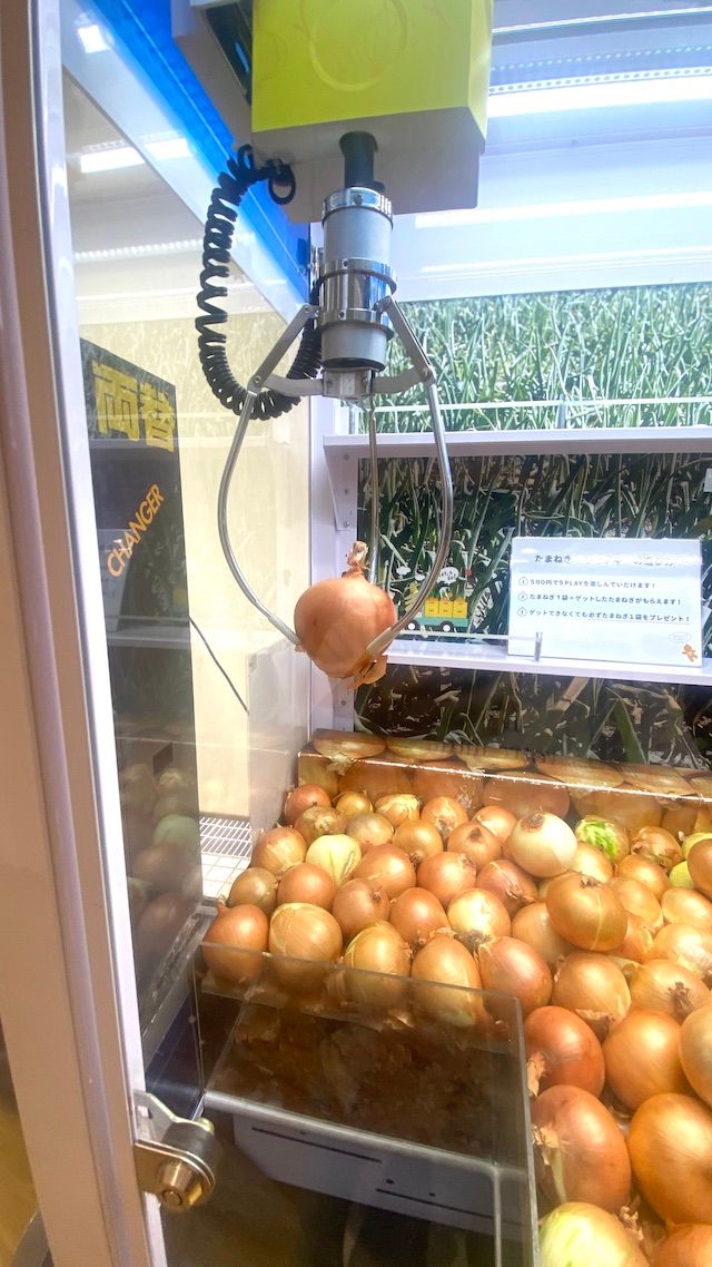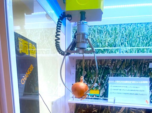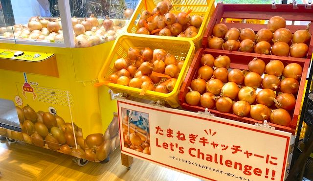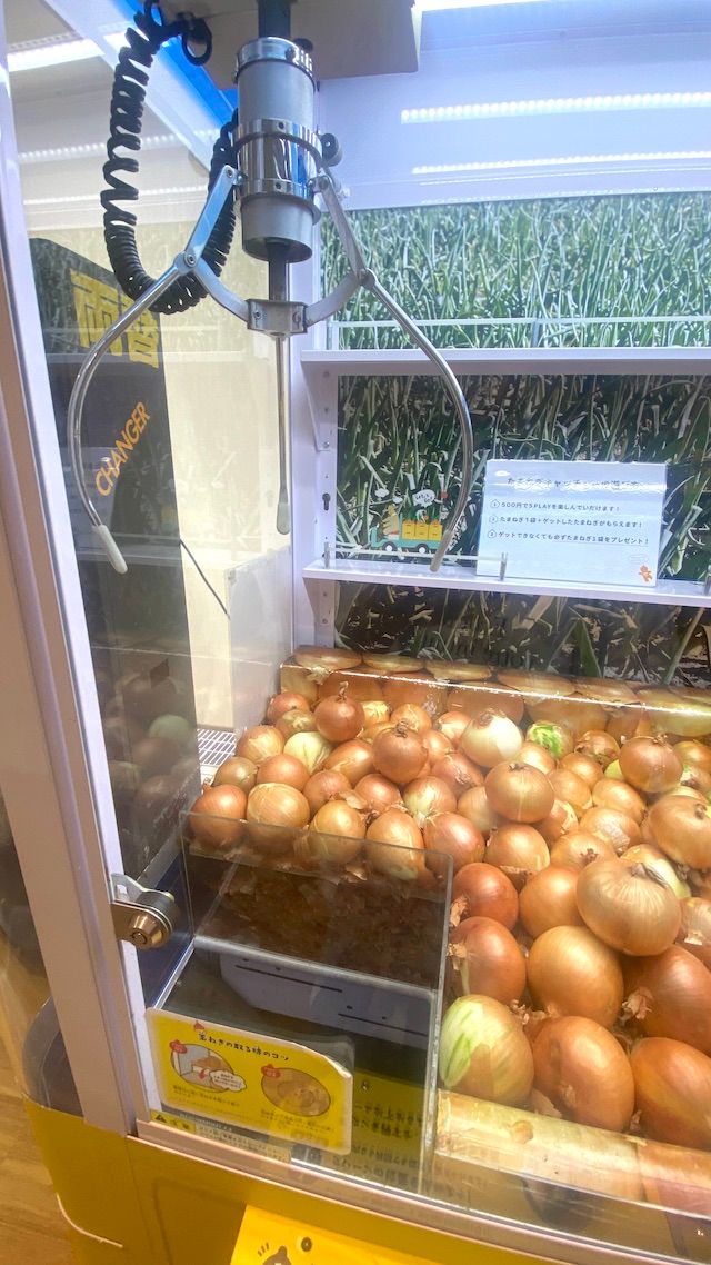 玉ねぎのクレーンゲーム「たまねぎキャッチャー」です! ちょうど直前に同施設のレストランで玉ねぎサラダのおいしさに感動していて、ぜひともお土産に買って帰りたいと思っていたのでした。