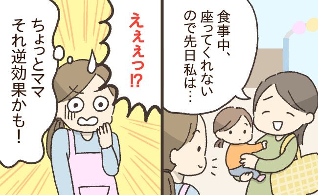 追いかけて食べさせると「歩いて食べてもOKなんだ」という認識になりますので要注意です。また、椅子から逃げ出した子どもに対して「待て待てー!」など大きなリアクションで対応すると、子どもはママに反応してもらって楽しいと思ってしまいますので、座らせるときは「椅子に座るよ」っと淡々と対応しましょう。