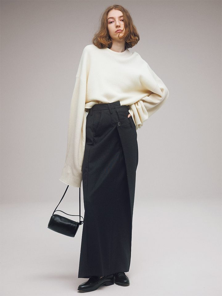 【POINT】そでのゆるんだカットソーが、クールなスカートスタイルに抑揚づけ。真逆のムードで組み合わせれば、モノトーンでも地味な印象はなし。