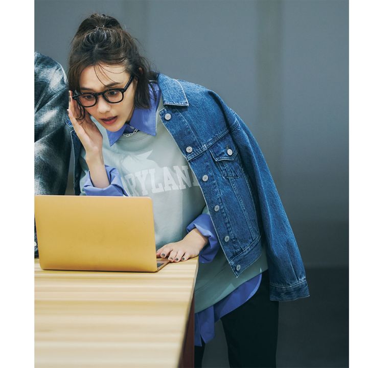 ストレート黒パンツ着回し ロゴスウェット¥4,490(グローバルワーク/アダストリアカスタマーサービス)ブルーシャツ¥13,200(ノーク)デニムジャケット¥14,300(SOMETHING/エドウイン・カスタマーサービス)メガネ※セットレンズ代込¥6,600(ゾフ/ゾフ カスタマーサポート)ネックレス¥18,700(Jouete)