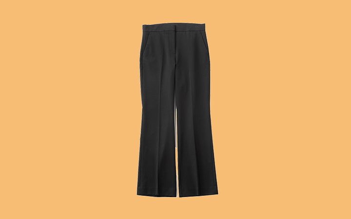 高見えパンツといえば、シルエットから素材感までパーフェクトな、信頼できる黒のワイドストレートパンツ。¥6,990(マンゴ)