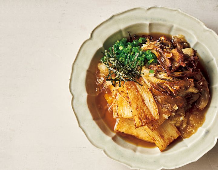 ごま油で香ばしく焼き上げた長いもとまいたけに、だしのうまみがマリアージュ。大根おろしで揚げ浸し風の味わいに。