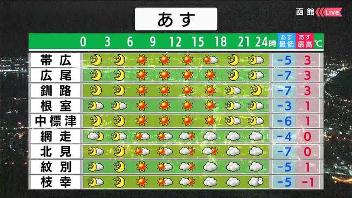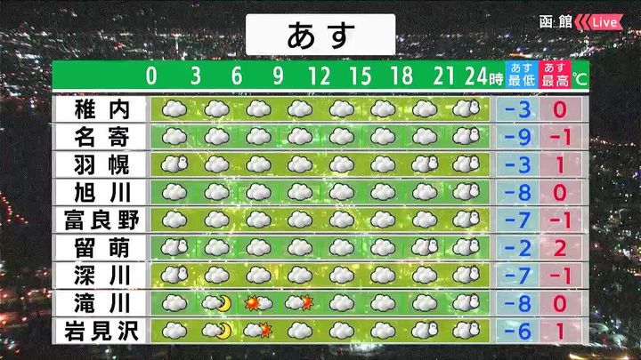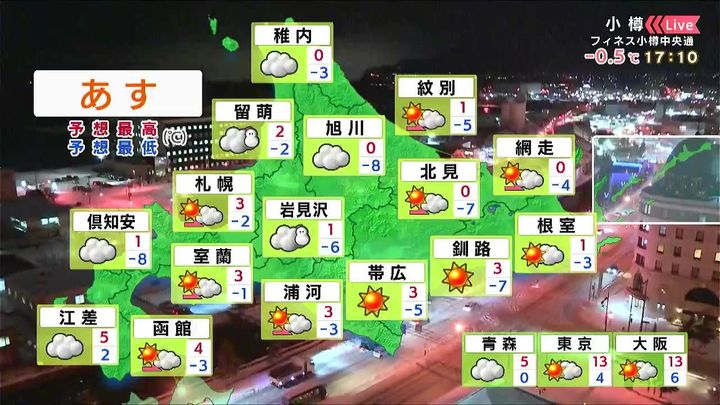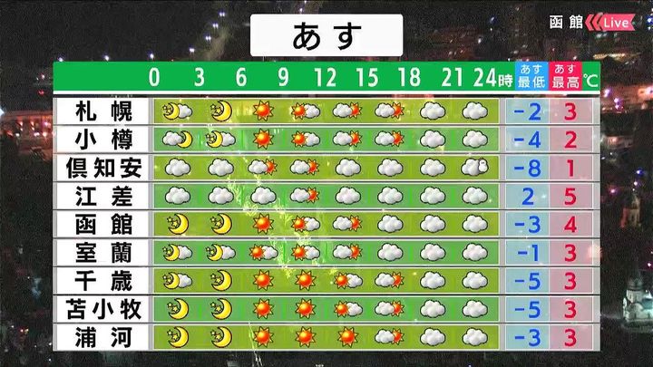 札幌や小樽、函館でもあすは晴れ間があるでしょう。風は弱く穏やかに経過します。倶知安の最高気温は1度で、5日ぶりにプラスの気温になりそうです。