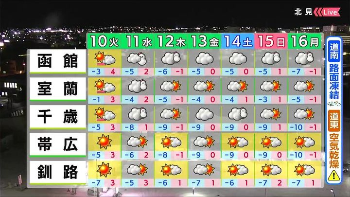 水曜日以降、函館では雪が降りやすく、路面凍結に注意です。室蘭や千歳も水曜日は雪が降りますが、道東は晴れて空気が乾燥するでしょう。寒気の影響で、水曜日以降は真冬並みの寒さの日が多くなります。