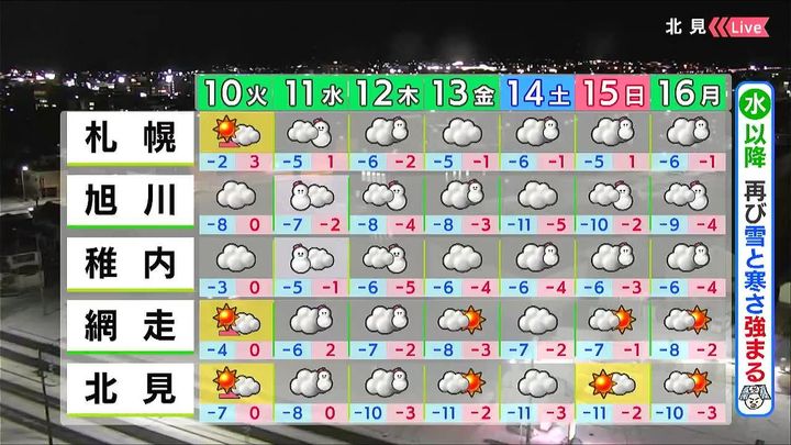 穏やかな天気はあすだけとなりそうです。11日(水)から12日(木)は再び道北や空知、後志を中心に積雪が増えるでしょう。11日(水)からは最高気温でもマイナスの真冬日が多く、朝晩は旭川や北見で‐10度くらいまで下がります。