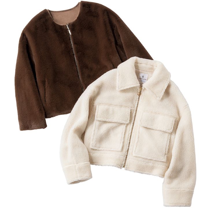 〈上〉エコファーコート¥30,800(ザ ポーズ/ウィム ガゼット ルミネ新宿店)〈下〉ボアジャケット¥41,800(ランバン オンブルー/レリアン)