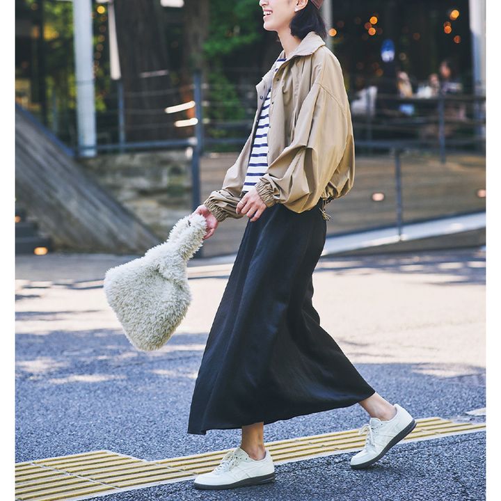 アウター¥17,600(emmi×KEEN/emmi ニュウマン新宿店)カットソー¥15,400(トラディショナル ウェザーウェア/トラディショナルウェザーウェア ルミネ有楽町店)スカート¥31,900(イレーヴ)キャップ¥8,690(SEA/エスストア)ピアス¥31,900リング¥44,000(ともにマリハ)バッグ¥12,100(スリードッツ/スリードッツ表参道店)スニーカー¥12,100(アシックス/アシックスジャパン カスタマーサポート部)