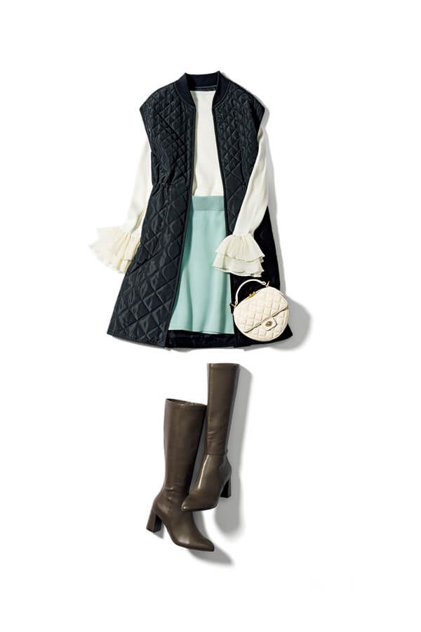 カジュアルなダウンベストと、甘めミニスカの甘辛バランスに。ロングブーツ合わせでさらに旬な着こなしに。