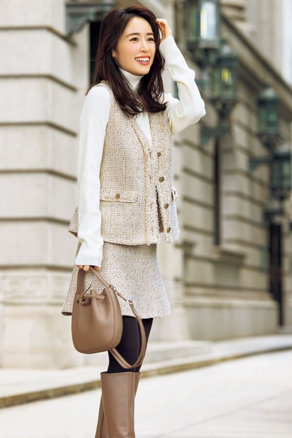 スパンコールやラメ糸を交ぜた華やかなツイードは、ジレとスカートのセットアップで都会的に着こなして。インナーのタートルニットをホワイト系にすれば、清廉なワントーンコーデが完成。