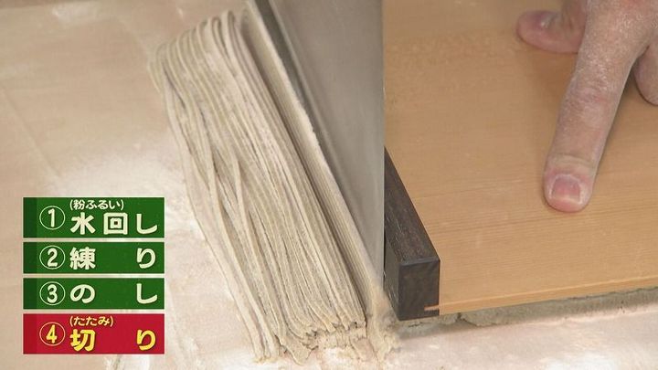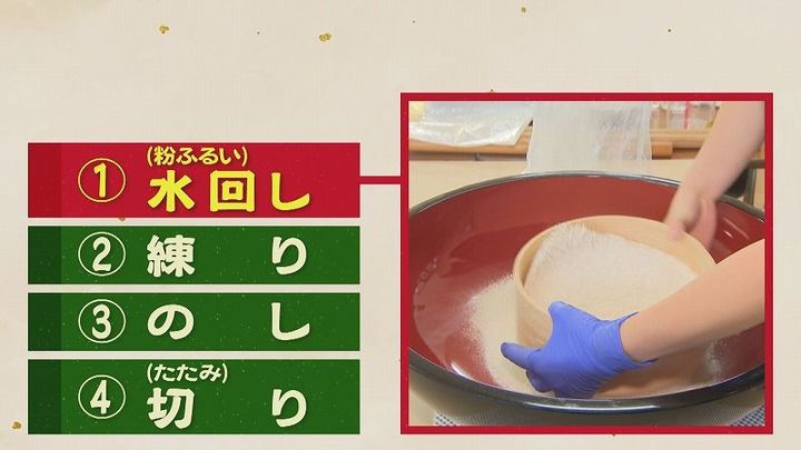 まずはそば粉と⼩⻨粉をふるいにかけて…「⽔回し」という作業に⼊ります。