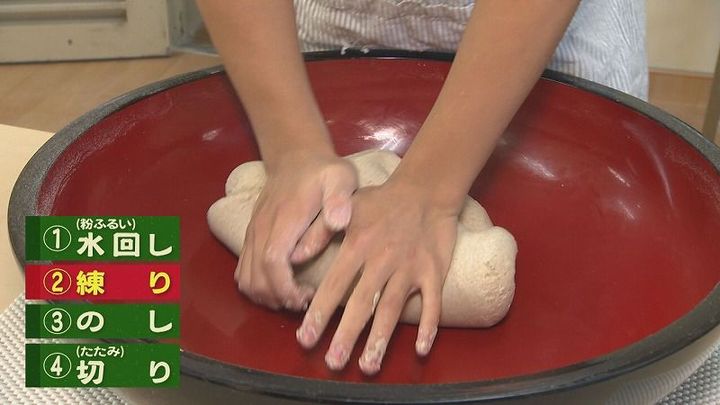 体重をかけて練りこむことでコシのあるそばを⽬指します。