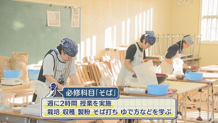 ⽣徒たちは週に2時間「そば」の授業を受けていて、そばの栽培から収穫、製粉、そば打ち、ダシの作り⽅、ゆで⽅まで学んでいます。