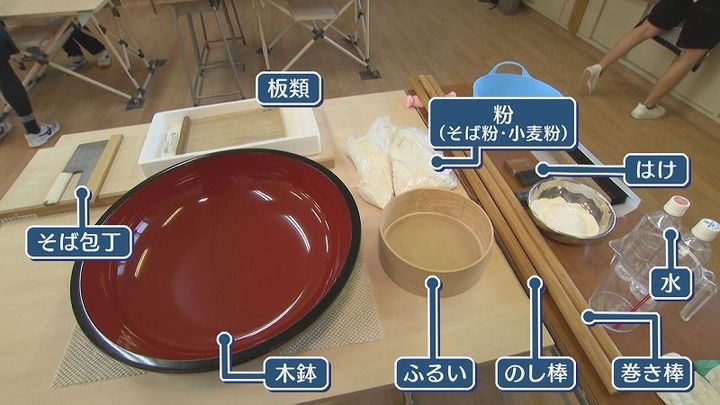 そば打ちに使うのはこちらの材料や道具。 時間を図りながら⼀⻫にスタートします。