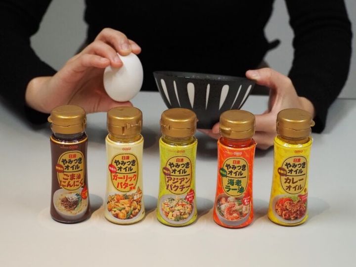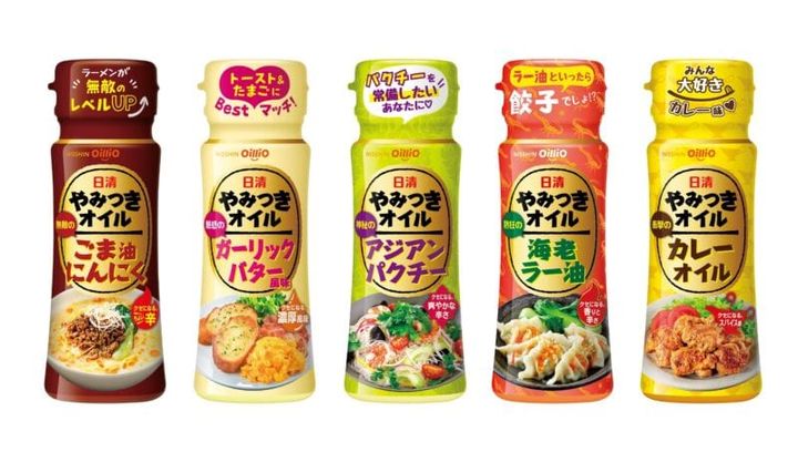 「やみつきオイル」のラインナップは、にんにくや香味野菜のうまみと香りをとじ込めた「ごま油にんにく」、ガーリックの風味に食欲が増す「ガーリックバター風味」、パクチー好きにはたまらない「アジアンパクチー」、ピリッと刺激的な味わいが楽しめる「海老ラー油」、ひとかけするだけでガラッと味が変わる「カレーオイル」の5種類。