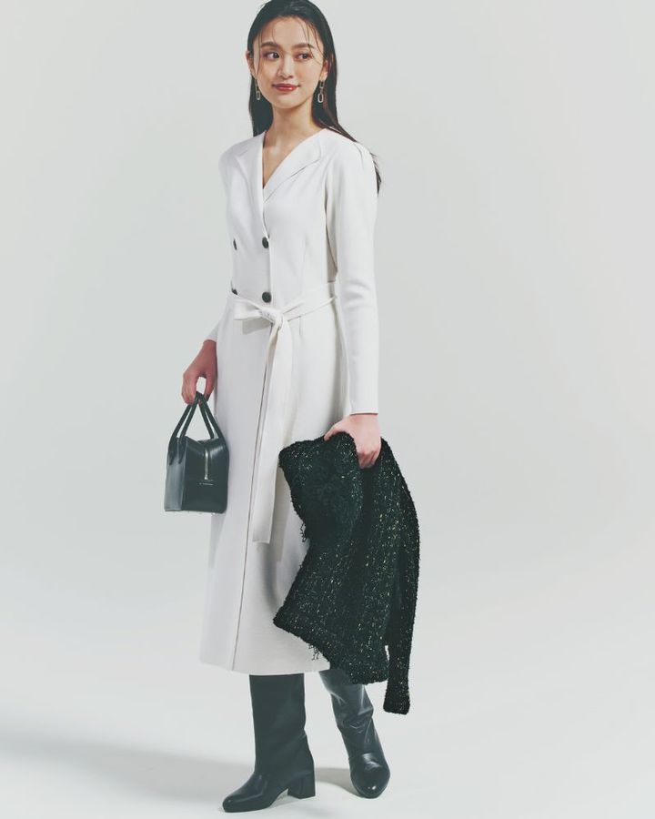 12月10日(火)、得意先の忘年会や会食など、ビジネスシーンながらもくだけた会も多いこの時季は、オンオフ兼備の一張羅アイテムが頼れます。トレンチ風のデザインワンピースを一点投入するだけで、スーツ姿と並んでも悪目立ちせず、ジャケットより肩肘張らない印象に。クリーンな印象になる白を選んだりデコルテ周りは襟付きにして、知的にまとめるのがポイントです。小物は黒レザーで失礼がないように引き締めつつ、ロングブーツやミニバッグでいつもとひと味違う、感度の高さをアピール。
