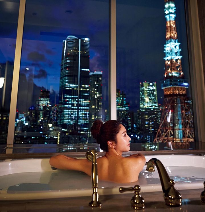 東京タワーを望む艶やかなバスタイムを過ごすのは、斎藤恭代さん。