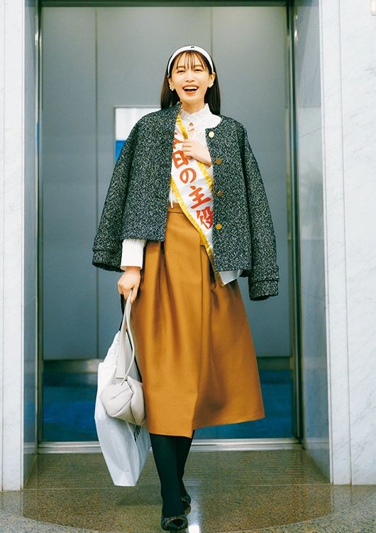 ツイードセットアップ(ジャケット)¥44,000/アルページュストーリー ギャザーブラウス¥8,990/アンフィーロ(オンワード樫山) ふんわりスカート¥25,300/ジャスグリッティー ロール型ショルダーバッグ¥8,800/カカトゥ(アンビリオン) パンプス¥33,000/ファビオ ルスコーニ(伊勢丹新宿本店本館2階 婦人靴) パールイヤリング¥3,960/KRONOS(ロードス) ヘアバンド¥990/プリンス(グローブライド)