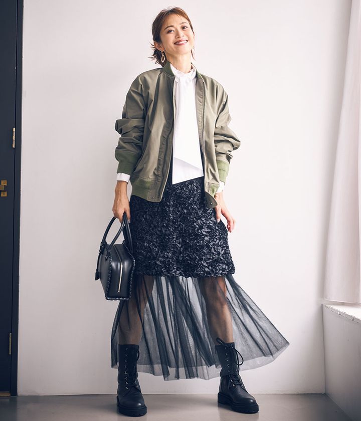 攻めた女っぽいスカートもカジュアルなカーキブルゾンで大人バランスに着地。