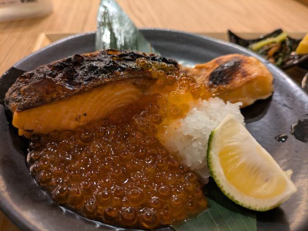 泣く子も黙る「鮭のこぼれいくら おむすび食べ比べ」(ランチタイム価格2,300円)。 ビッグサイズの鮭にいくらがこれでもかと惜しげもなくオンしております!!これは合法なのでしょうか?!