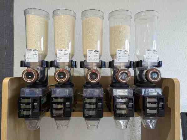 お米の量り売りコーナー発見!ここでは100gずつ購入することができます。 5kgはちょっと多いんだよね…という方にはありがたい計らいですね。