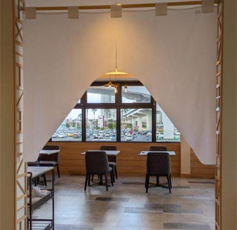 のれんをくぐると、明るく広々とした空間が目に飛び込んできます! そして特徴的な大きな窓からは香椎海岸が望めます。なんてステキなロケーション!