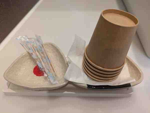 そして、こんなところにも! トイレの手洗い場におむすびの器を発見!つまようじと紙コップがおいてありました。 こまかい演出が粋ですね〜!