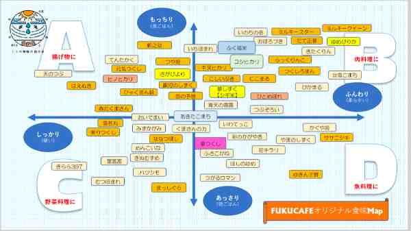 お米がいろいろありすぎてどれを選んでいいのか分からない方のために、食味Mapが掲示してあります。これを見ながらお気に入りを探すのもたのしいです!