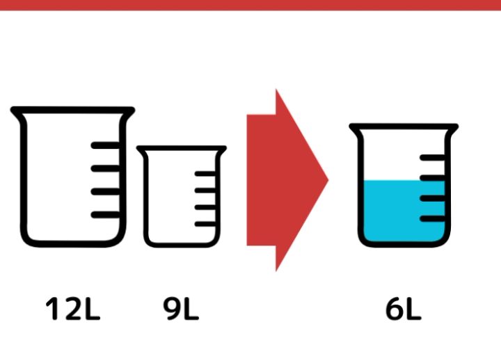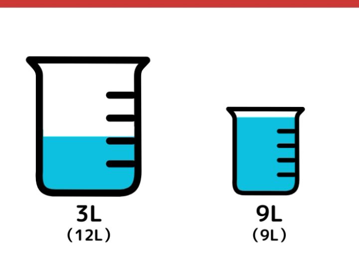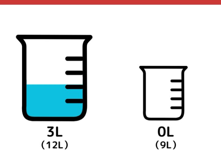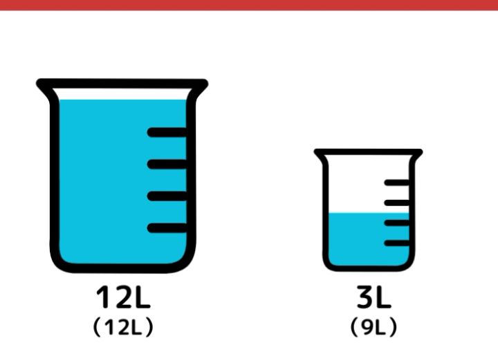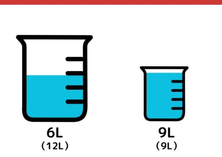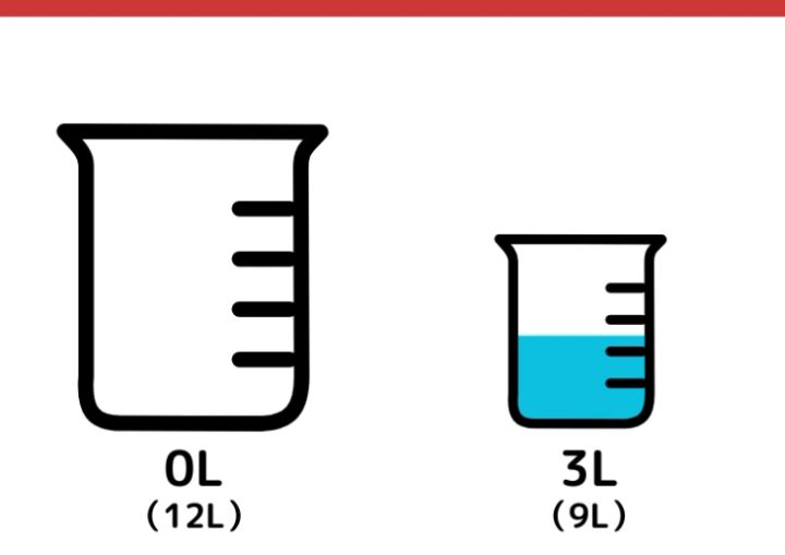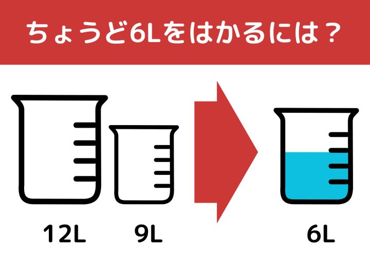 水がちょうど6L入る容器が手元にありません。今手元にあるのは、12Lと9Lの容器です。この2つの容器を使って6Lの水を計るにはどうすればよいでしょうか?