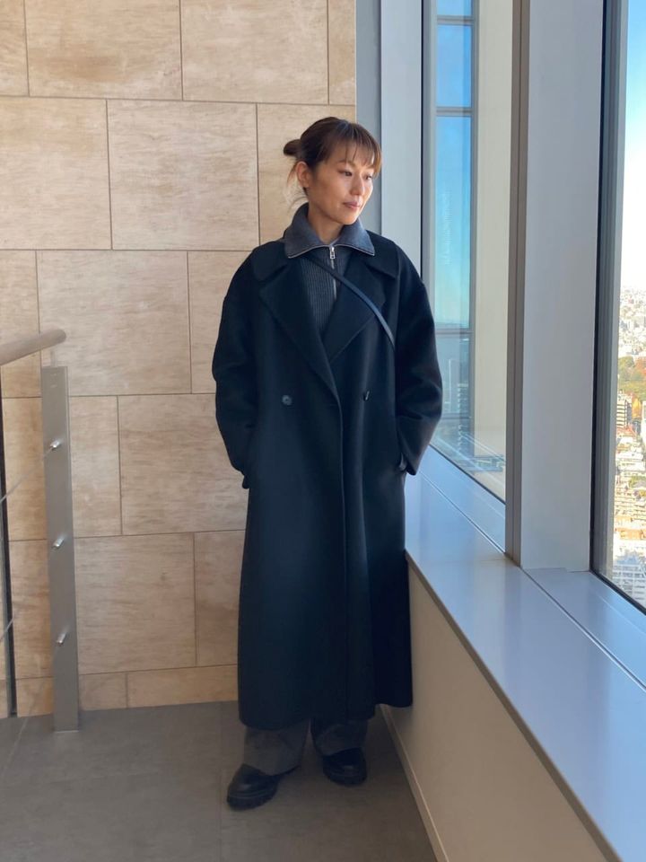「カラーは黒とグレーでまとめ、ひとつ大きいサイズを選んだテーラードコートを取り入れるなど、ハンサムな要素でまとめました。インナーに着ているニットはメンズのもので、襟のあき具合をジップで調整でき、いろいろな着方を楽しめるので気に入っています」