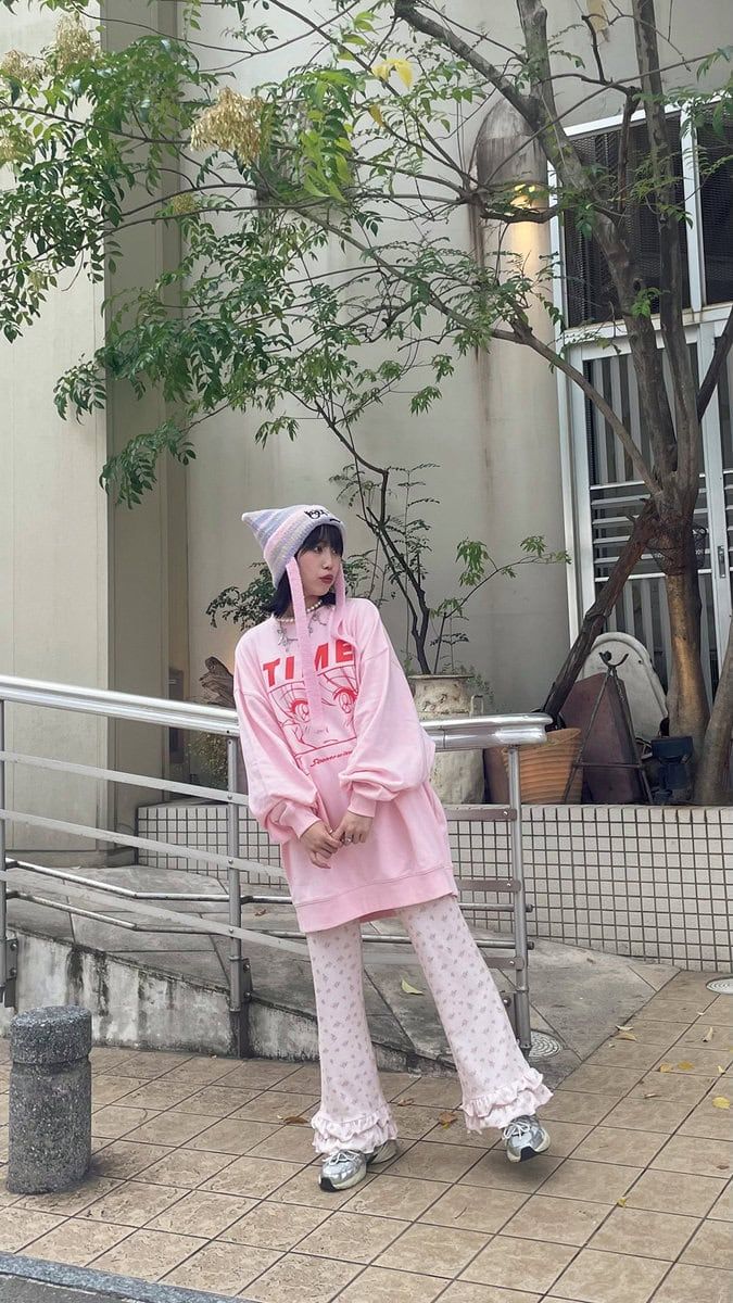 スウェットは、ラフに着るのが好きなのでメンズサイズくらい大きいものをセレクト。タイトなフレアパンツを合わせることで、コーデのバランスを取りました! ピンクカラーに赤いロゴと女の子のイラストがポイント♡