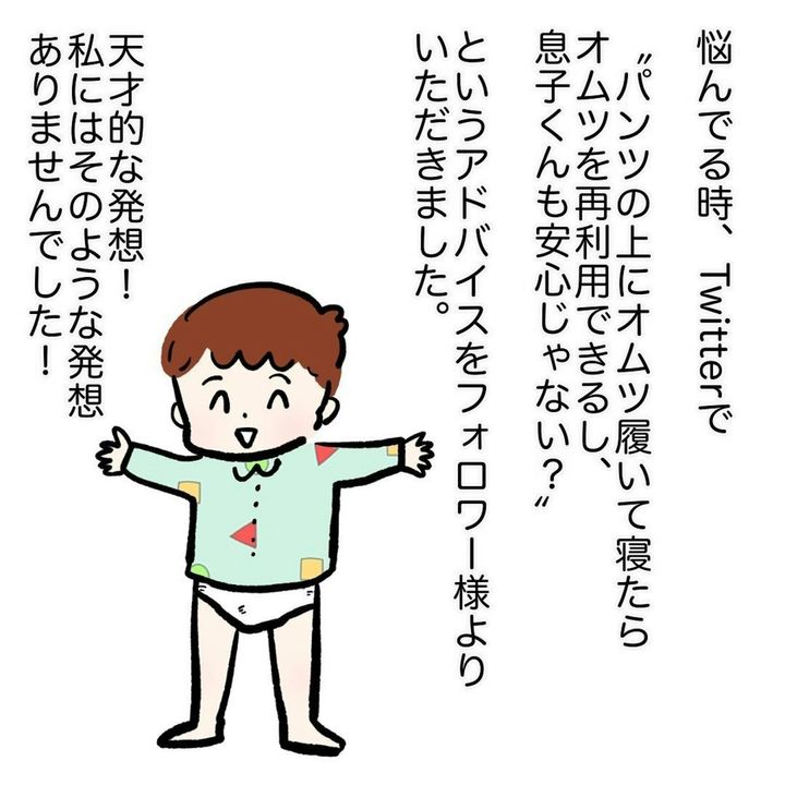 皆さんは、わが子のトイトレで困ったことはありますか?トイトレの進み方には個人差があります。また、さまざまな方法がある一方で子どもによる合う・合わないもあり、悩む人がたくさんいるのではないでしょうか。カコマツ(@kaco_ma_tsu)さんもわが子のトイトレで悩んでいるママ。おむつがないと安心して眠れないというわが子。おねしょすることはないため「おむつがもったいない」と悩むカコマツさんが見つけたアイデアは?