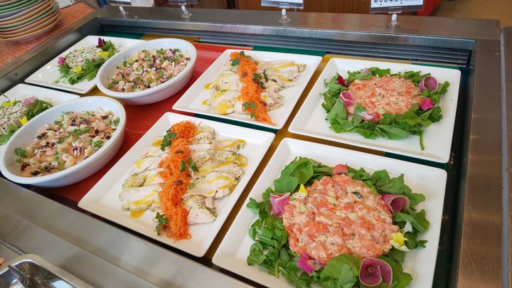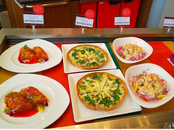 前菜コーナーには「ズワイガニとサーモンのタルタル仕立て」「鶏むね肉のポッシェとキャロットラぺ」