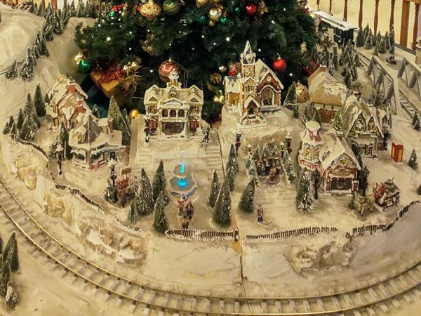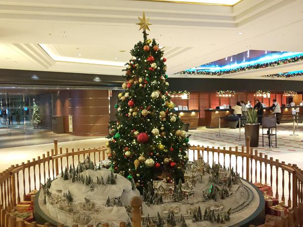 シェラトンの名物!ともいえる、ツリーの周りを電車のおもちゃが走る「クリスマスツリー&クリスマストレイン」は、今年も2階ロビーにお目見え。