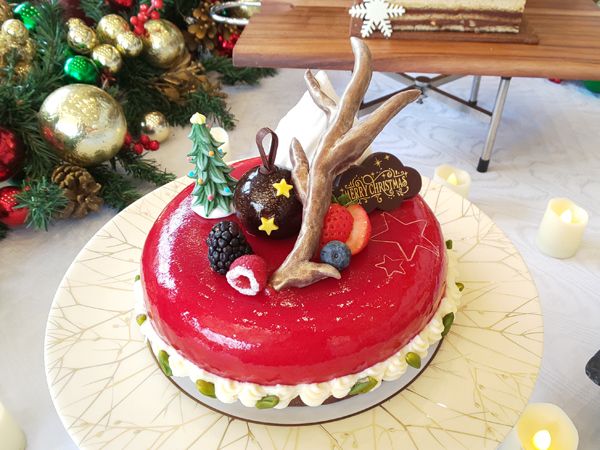 フランス語で“赤”を意味するルージュ。その名の通り、真っ赤なフランボワーズが鮮やかなムースケーキです。チョコレート風味のタルト生地の上には、濃厚な苺ムースをのせ、トナカイの角をイメージしたチョコレートやツリーのオーナメントがアクセントになっています。