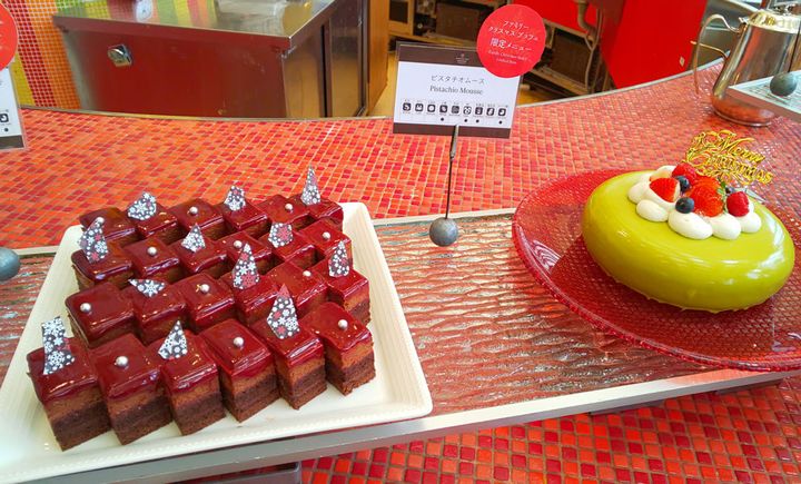 クリスマスカラーで、見た目鮮やかな「ピスタチオムース」と「チョコレートとラズベリーのケーキ」。