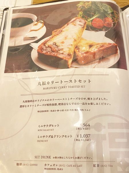 モーニングセット「丸福カリートーストセット」820円。珈琲、またはカフェオレ、または紅茶付き