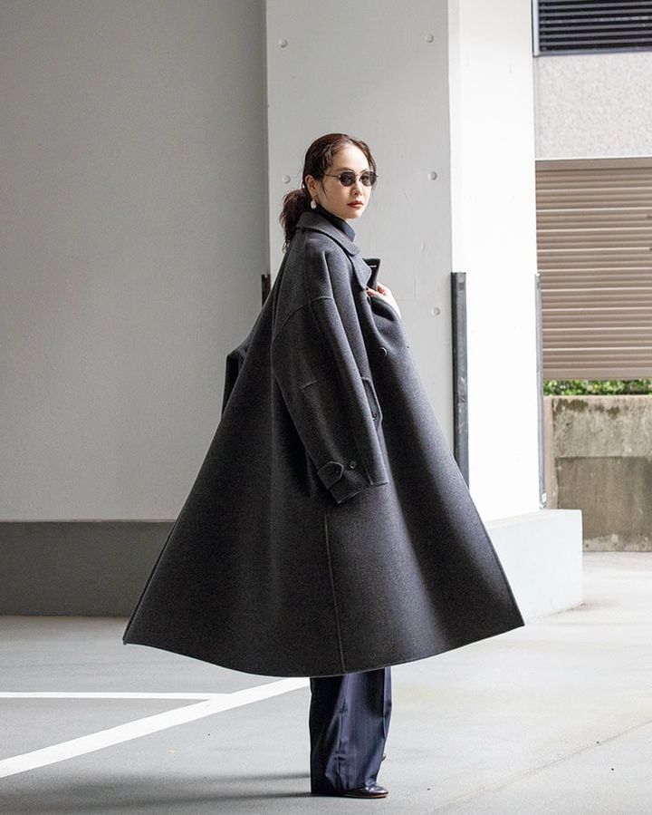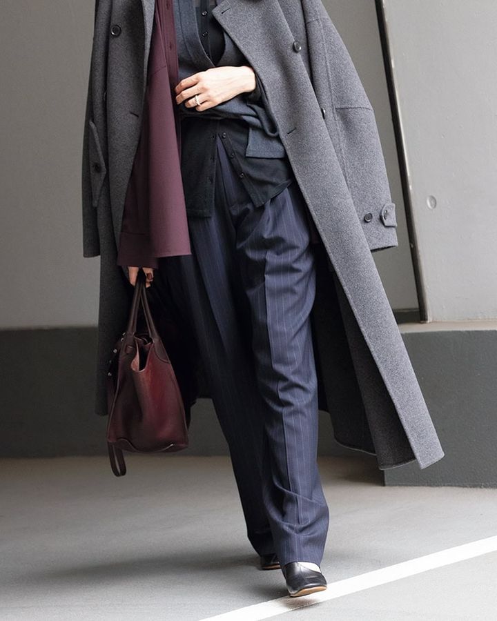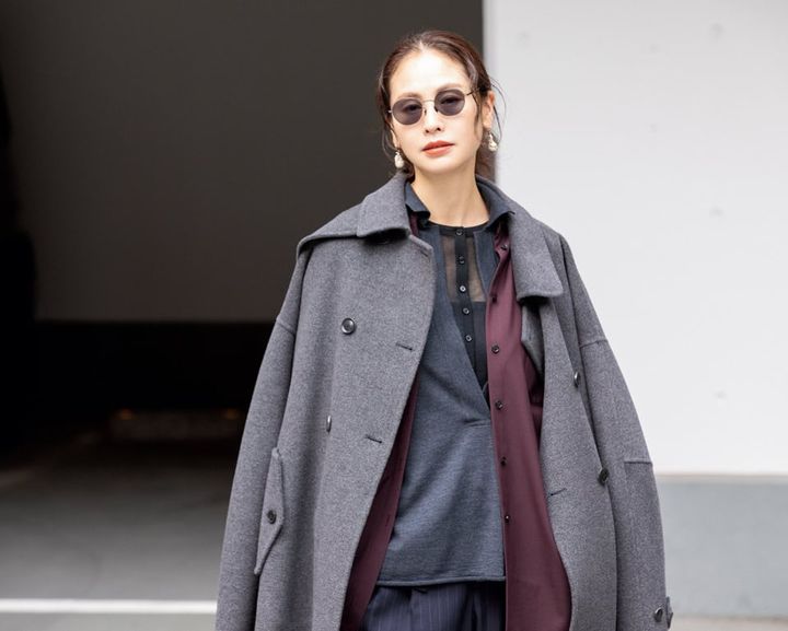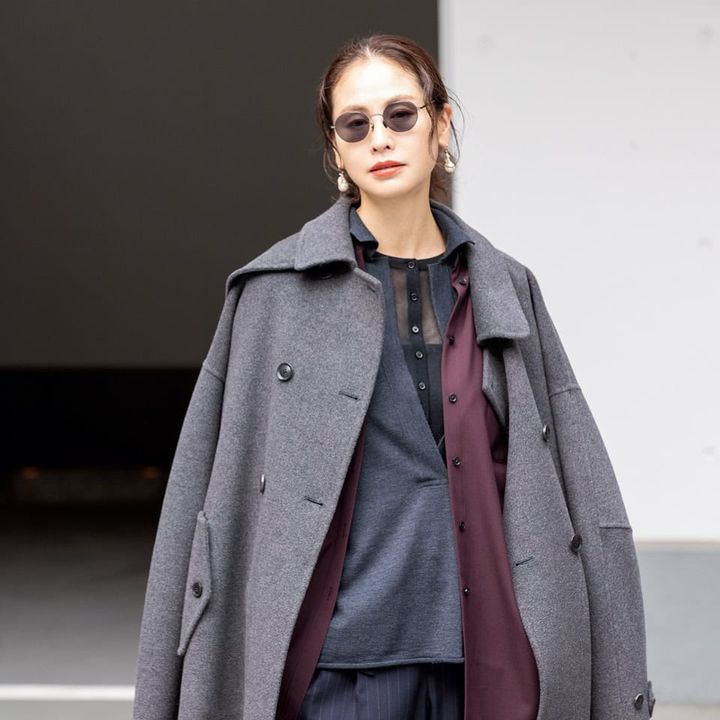 「スキッパーニット(首もとに襟がついたデザイン)にシャツ、コートと、今気になっているシックなカラーを重ね合わせたのがポイント。全体的にマスキュリンな雰囲気ですが、インナーにラメ入りのシアーカーディガンやパールのピアスを合わせ、さり気なく女性らしさをきかせました」(二ノ宮和佳子さん)