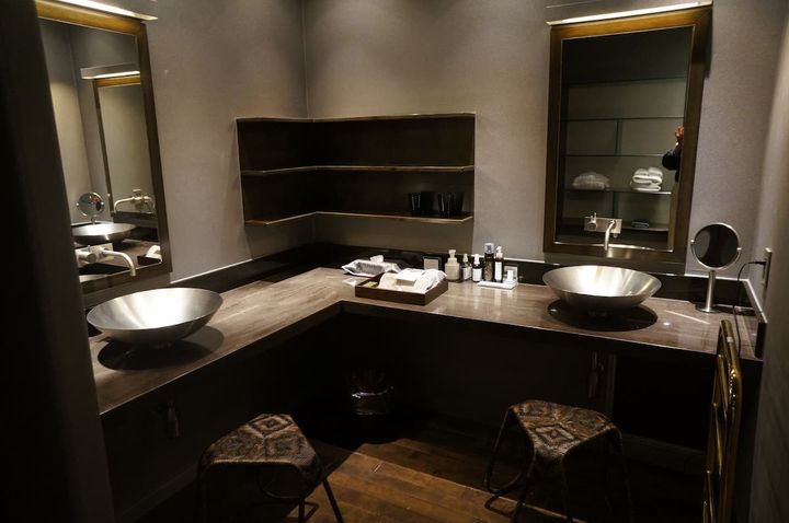 ラグジュアリースイートは、浴室の造りもハイグレード。まずは脱衣室から。洗面台が2面あり、ステンレスの洗面ボウルやドリアデ社のパトリシア・ウルキオラのスツールが生活感を感じさせないオシャレな空間を演出しています。