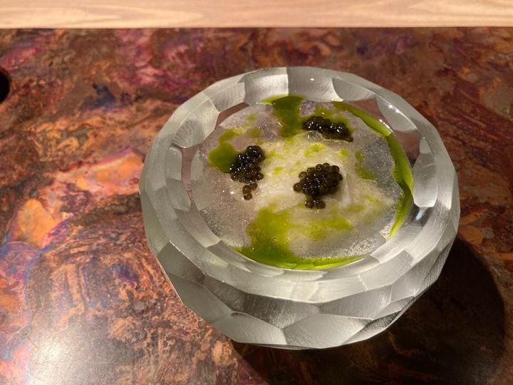 こちらは「八尾町で作られた大豆・あまうららの豆乳を使用した豆腐と自家菜園の野菜のガズパチョジュレ、天然葉ワサビのオイル」。カットガラスの生み出す涼やかな質感がガスパチョの野菜の青味の味わいとリンクして深く印象に残ります。