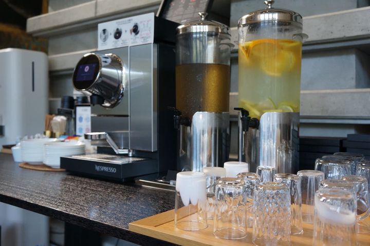 ロビーにはコーヒーや紅茶、黒文字茶、デトックスウォーターなどの宿泊者専用のドリンクコーナー(6~11時、14~22時)が設けられているので、ソファに腰掛けて飲み物をいただきながら、ゆっくりとこの空間のすばらしさに浸ってみてください。