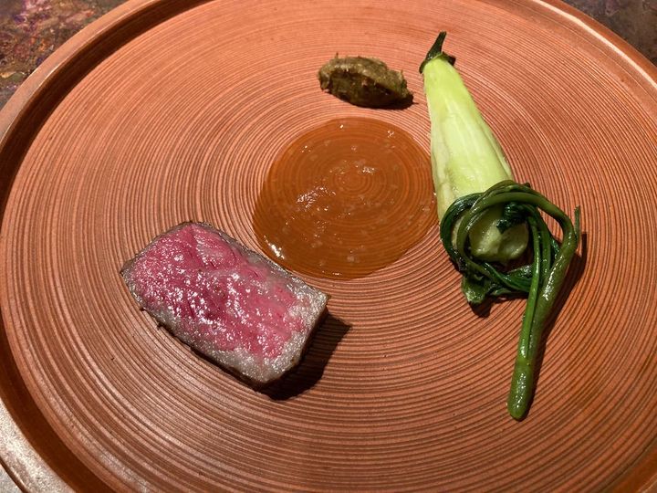 メインの肉料理は「立山・柏ファームのとやま酒粕育ちの和牛 薪焼」。酒粕で育てる富山のブランド牛「とやま和牛 酒粕育ち」の肉質が軟らかく甘みのある味わいももちろんおいしいのですが、それと並ぶほどの感動があったのは甘くみずみずしいナスです。